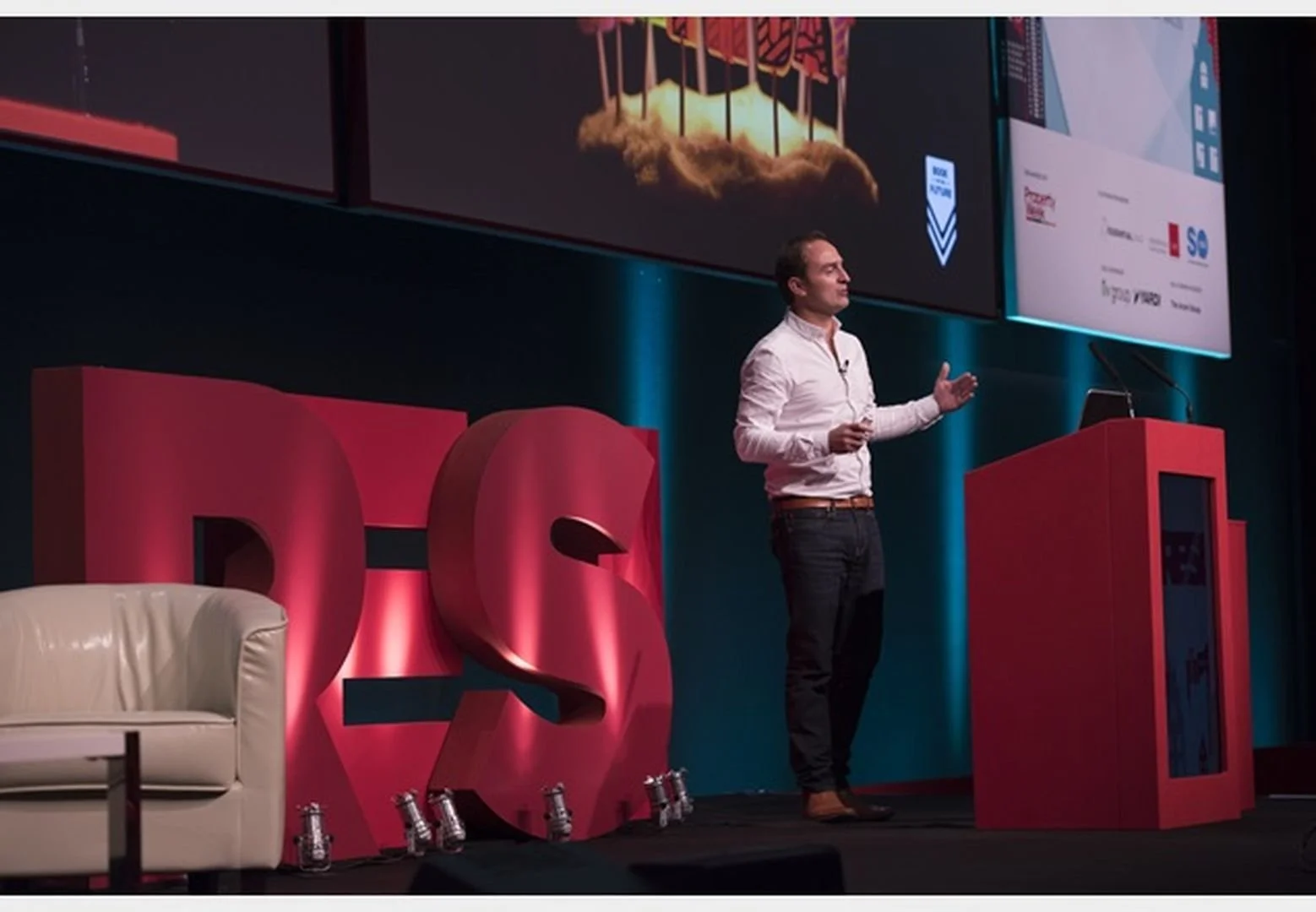 Tom Cheesewright talking about future cities in the closing keynote at the Property Week RESI conference in Cardiff, 2017